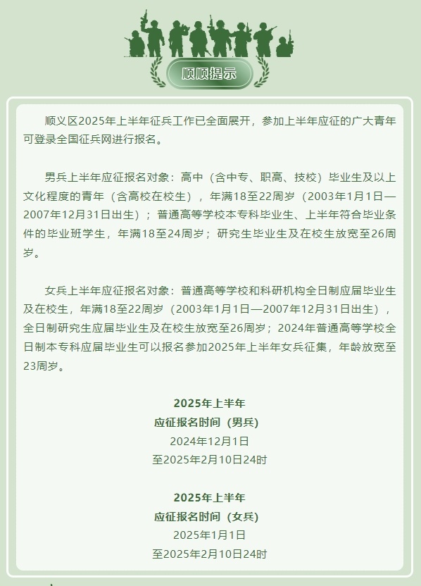 轉(zhuǎn)載請注明來自濰坊公路發(fā)展集團有限公司,本文標題:《關(guān)于2025年參軍上半年報名的全面解析,2025年上半年參軍報名全面解析》