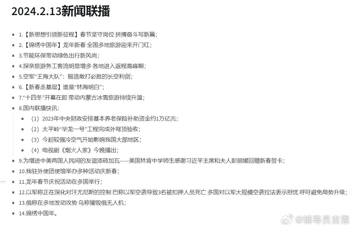 國際政治局勢一直是新聞聯(lián)播報道的重要內(nèi)容之一,在即將到來的2024年,我們將關(guān)注國際政治局勢的最新動態(tài),包括各國之間的關(guān)系、國際安全形勢等方面的問題,新聞聯(lián)播將深入分析國際政治局勢的發(fā)展趨勢和未來走向,為我們提供全面的分析和深入的思考,同時還將關(guān)注各國在國際事務(wù)中的立場和態(tài)度,還將重點關(guān)注國際間的合作與交流,探討全球化背景下的國際合作前景,隨著全球化的深入發(fā)展,各國之間的合作與交流日益密切,新聞聯(lián)播將關(guān)注國際間的經(jīng)濟合作、文化交流等領(lǐng)域的合作成果與挑戰(zhàn),同時還將關(guān)注國際組織在全球治理中的作用以及跨國企業(yè)在國際合作中的貢獻(xiàn)等話題,通過深入挖掘這些領(lǐng)域的成功案例與經(jīng)驗做法為國際社會提供有益的參考與啟示,三、結(jié)語展望未來充滿信心在新的一年里我們將繼續(xù)見證祖國的繁榮昌盛和世界的和平發(fā)展讓我們緊密團結(jié)在一起共同迎接更加美好的明天通過新聞聯(lián)播這一重要窗口我們將更加全面地了解國內(nèi)外的最新動態(tài)與時俱進(jìn)地把握時代發(fā)展的脈搏共同為實現(xiàn)中華民族偉大復(fù)興的中國夢努力奮斗!總之在即將到來的2024年我們將通過新聞聯(lián)播這一重要平臺見證祖國的繁榮和發(fā)展世界的和平與進(jìn)步讓我們攜手共進(jìn)共同書寫未來的輝煌篇章!
