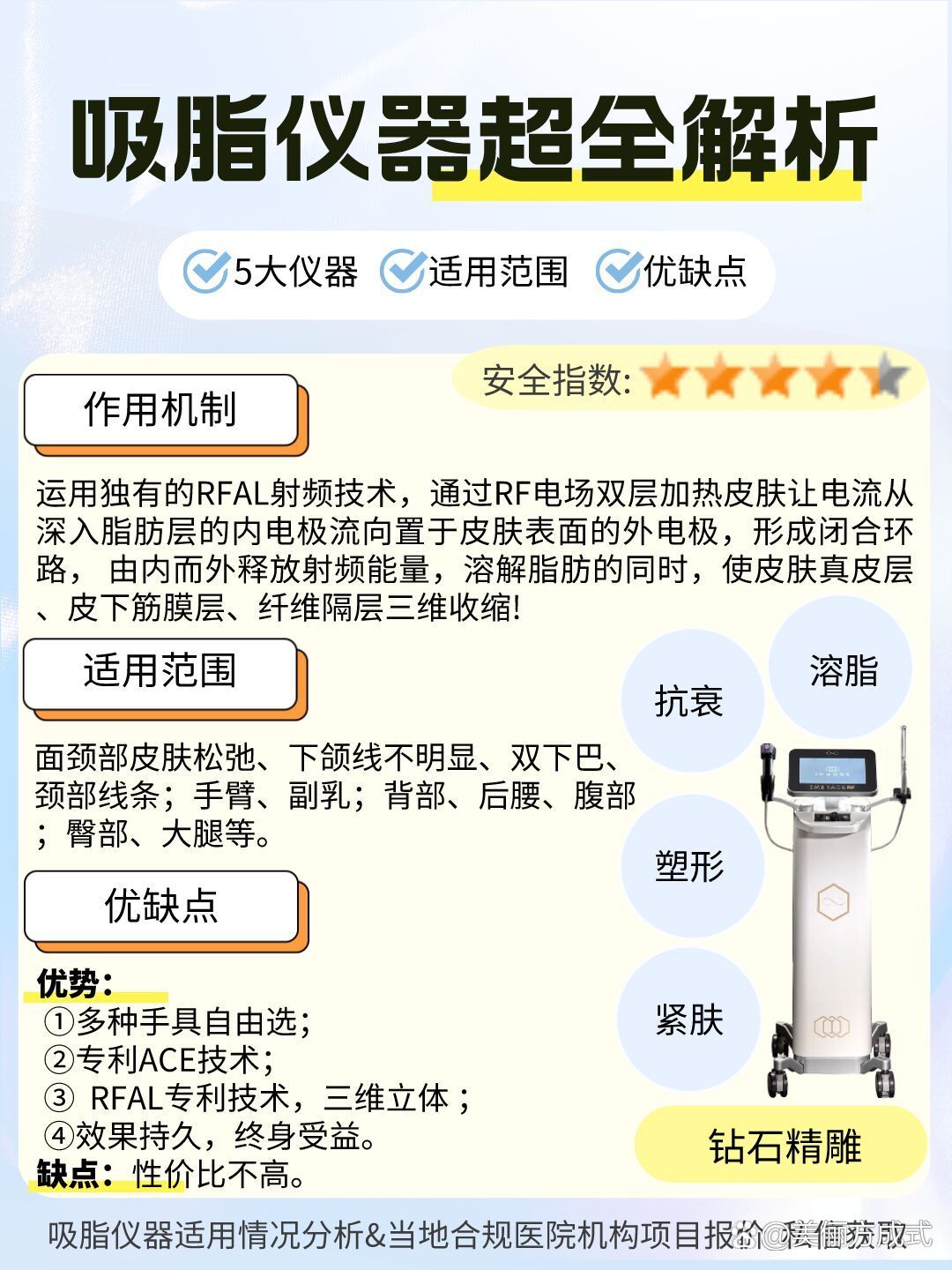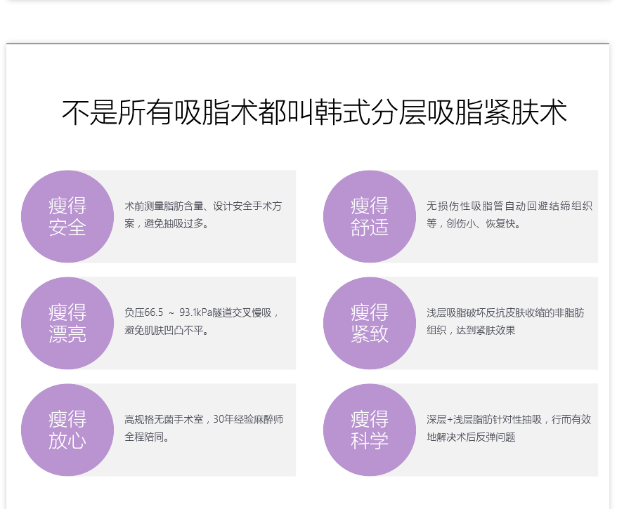 4、并發(fā)癥:所有手術(shù)都有一定的并發(fā)癥風(fēng)險,但先進的吸脂技術(shù)如超聲波吸脂、激光吸脂和水動力吸脂的并發(fā)癥風(fēng)險相對較低。